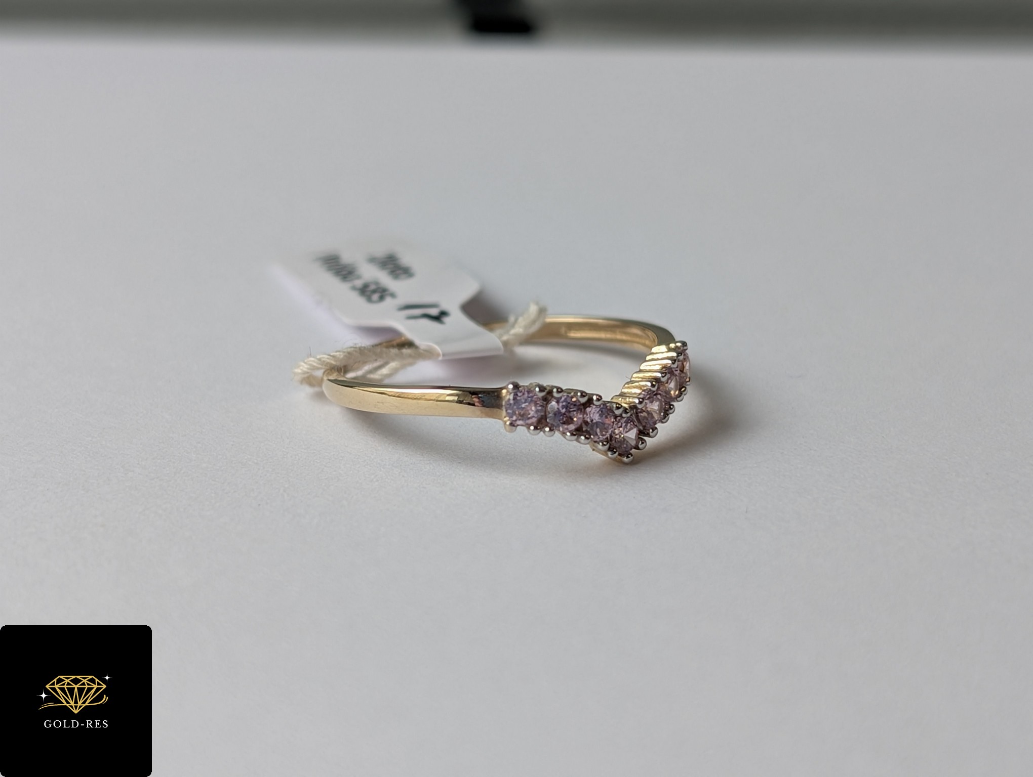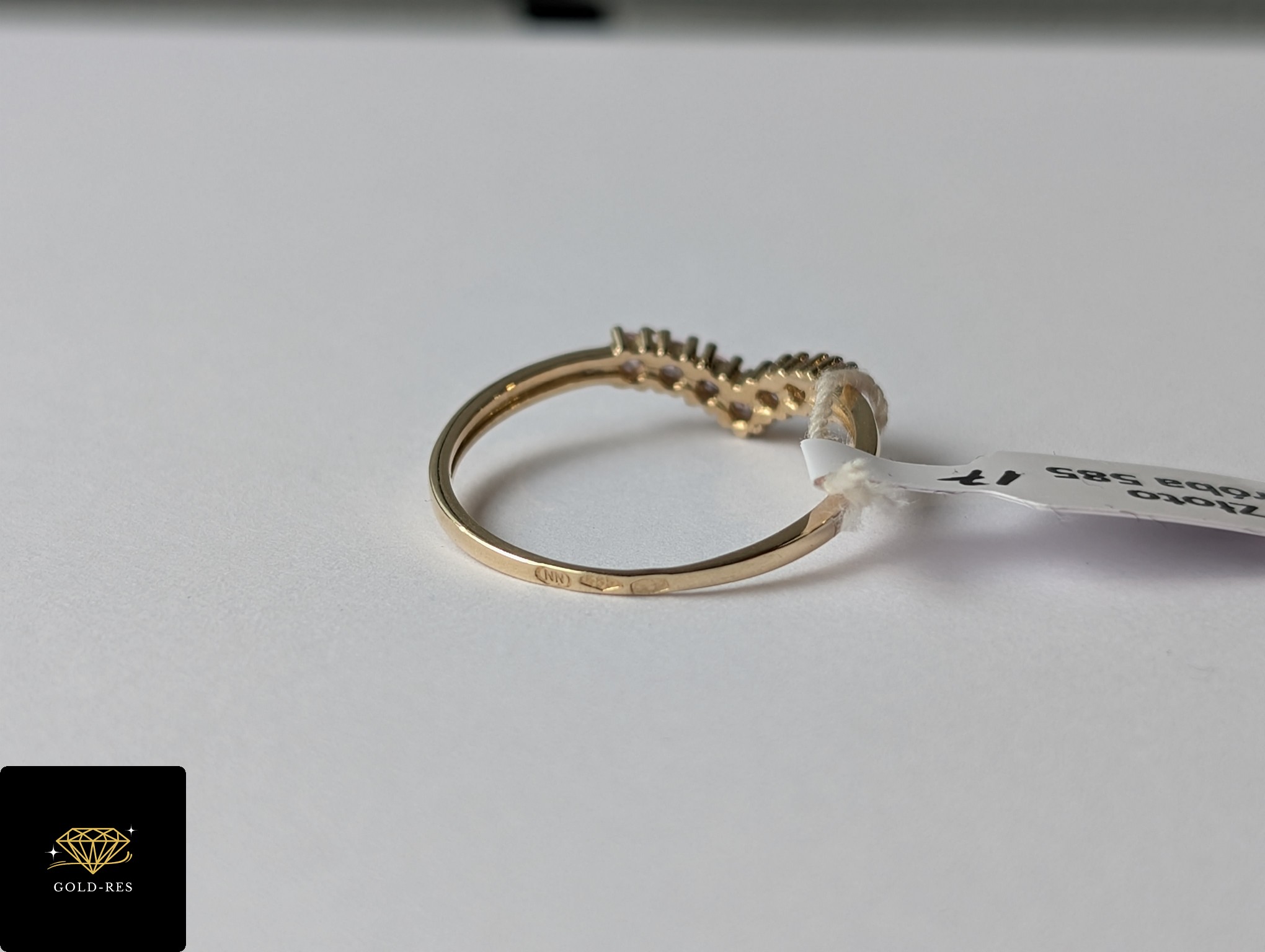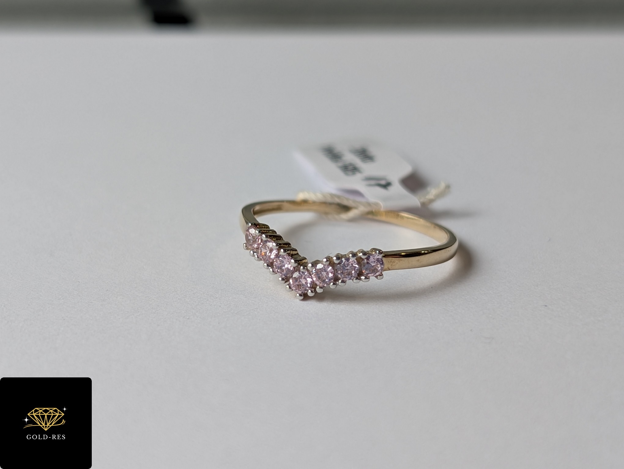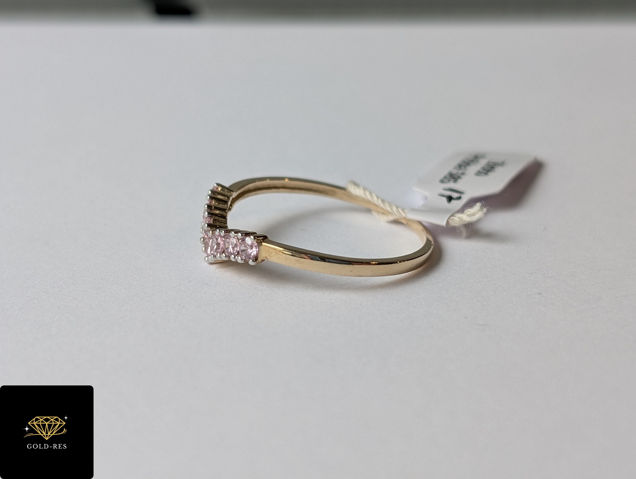 Do sprzedania złoty pierścionek, w próbie złota 585. Wyrób jest zupełnie NOWY – posiada cechę probierczą. Cyrkonie mają kolor jasny różowy.