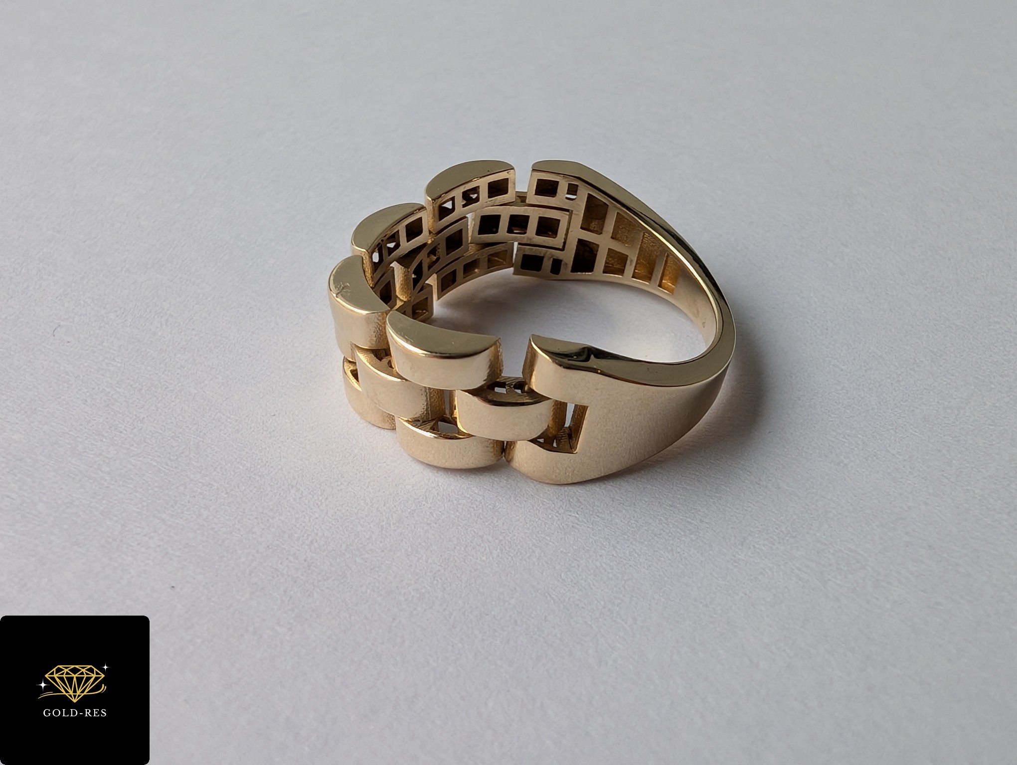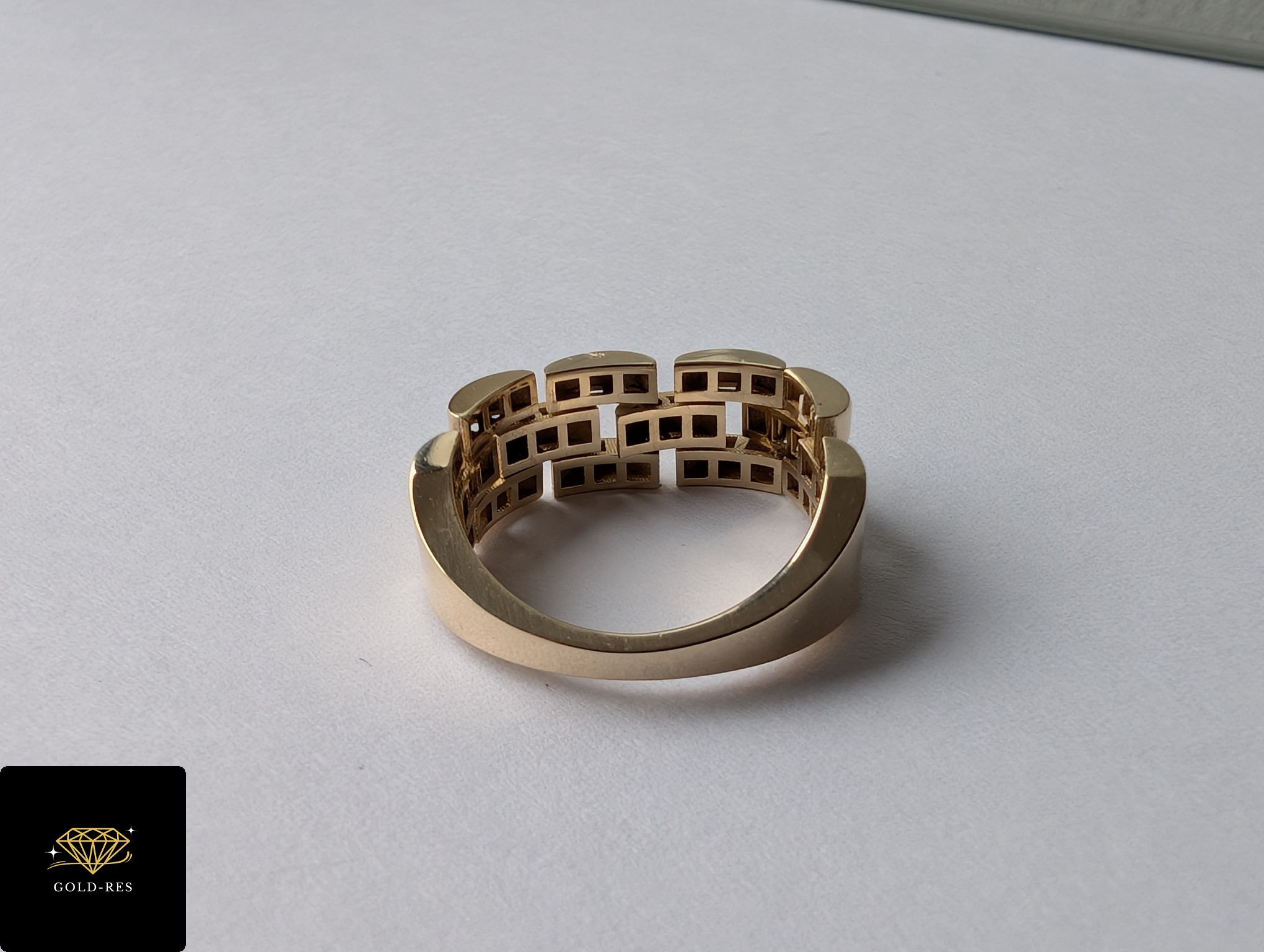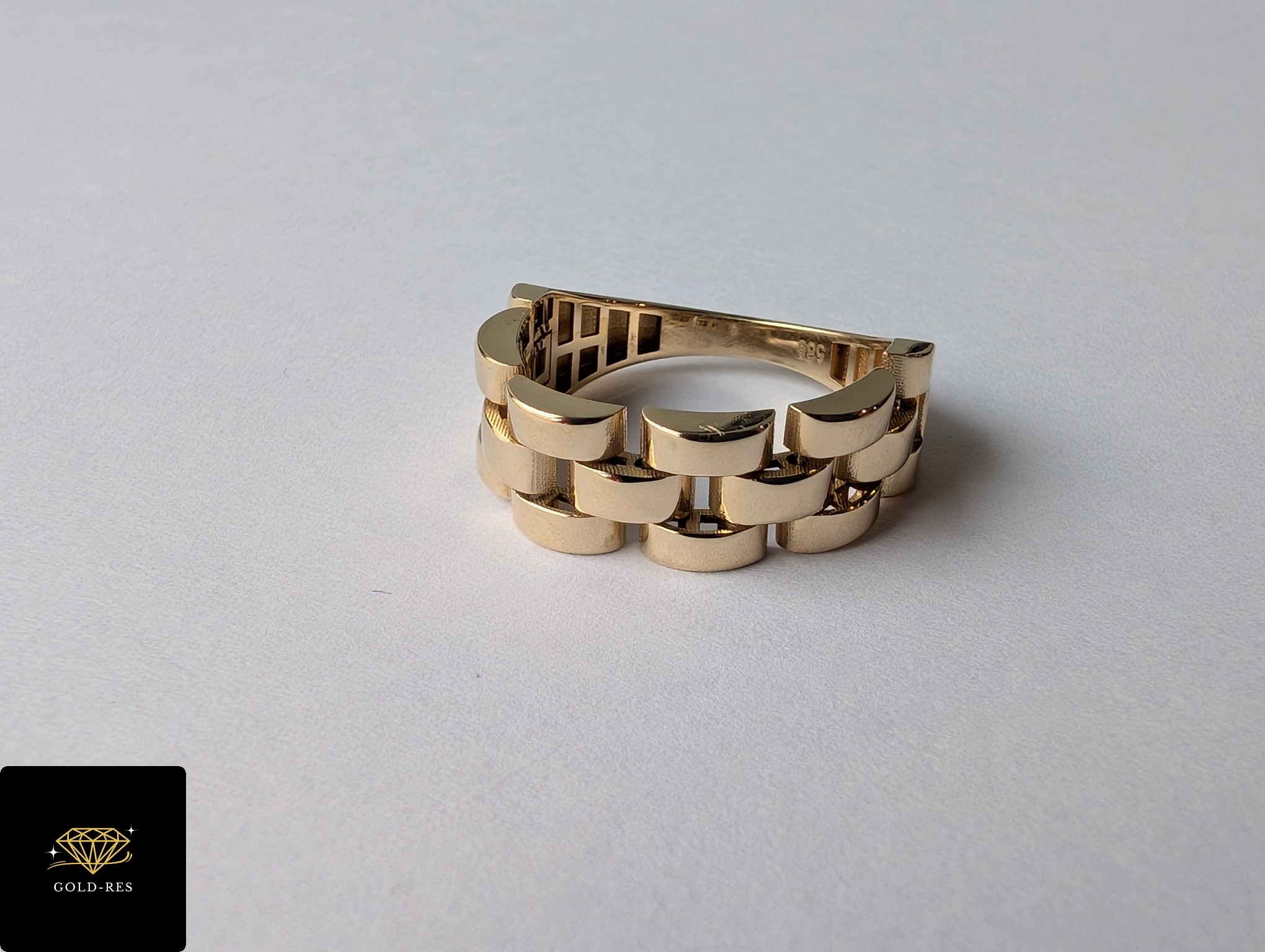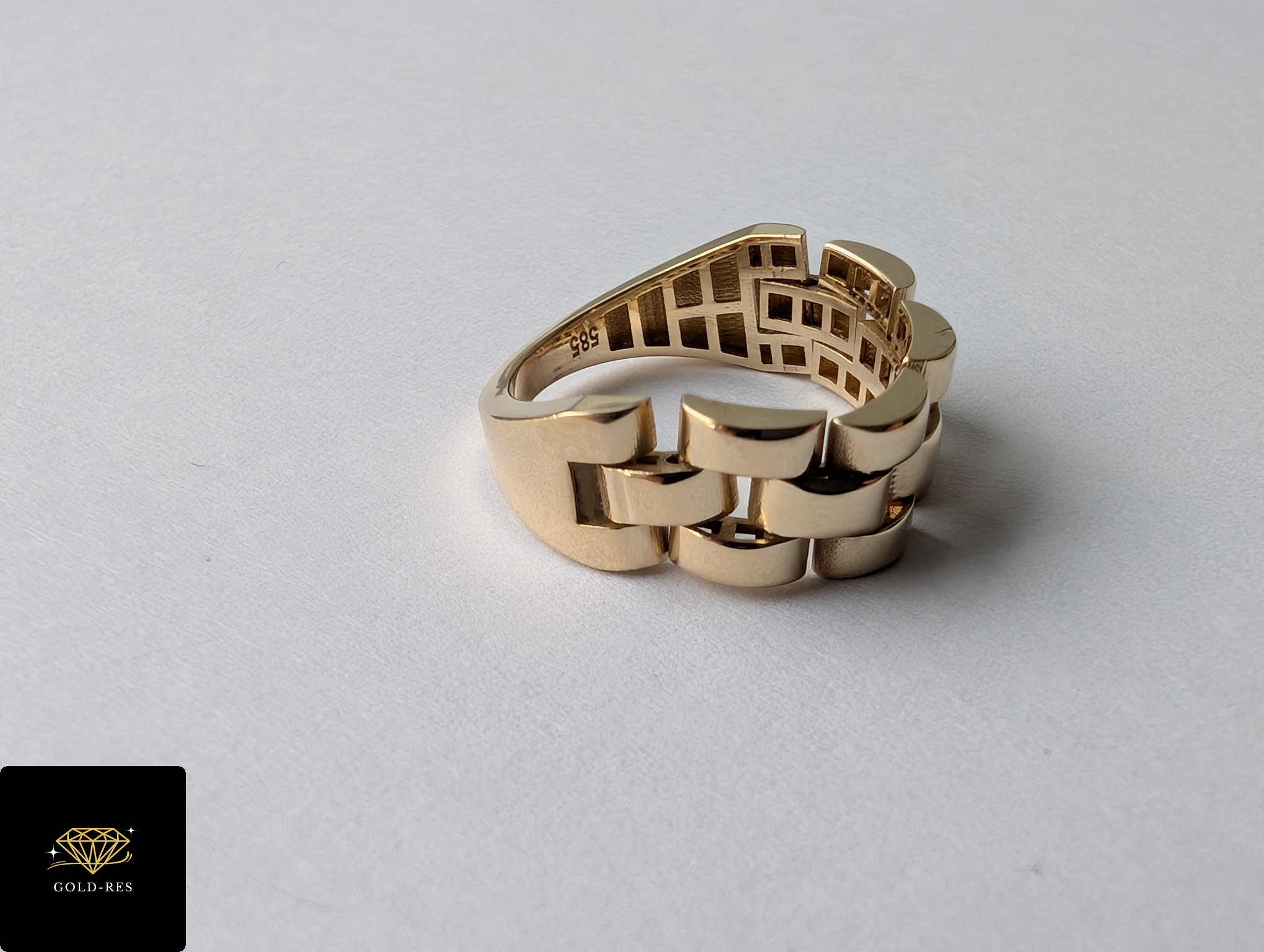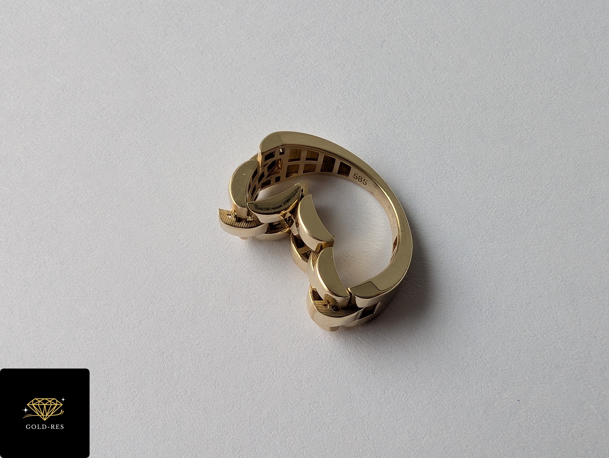 Do sprzedania złoty pierścionek, w próbie złota 585. Wyrób jest używany – posiada oznaczenie próby złota. Góra pierścionka (ta ze wzorem) jest ruchoma – na styl bransoletki.