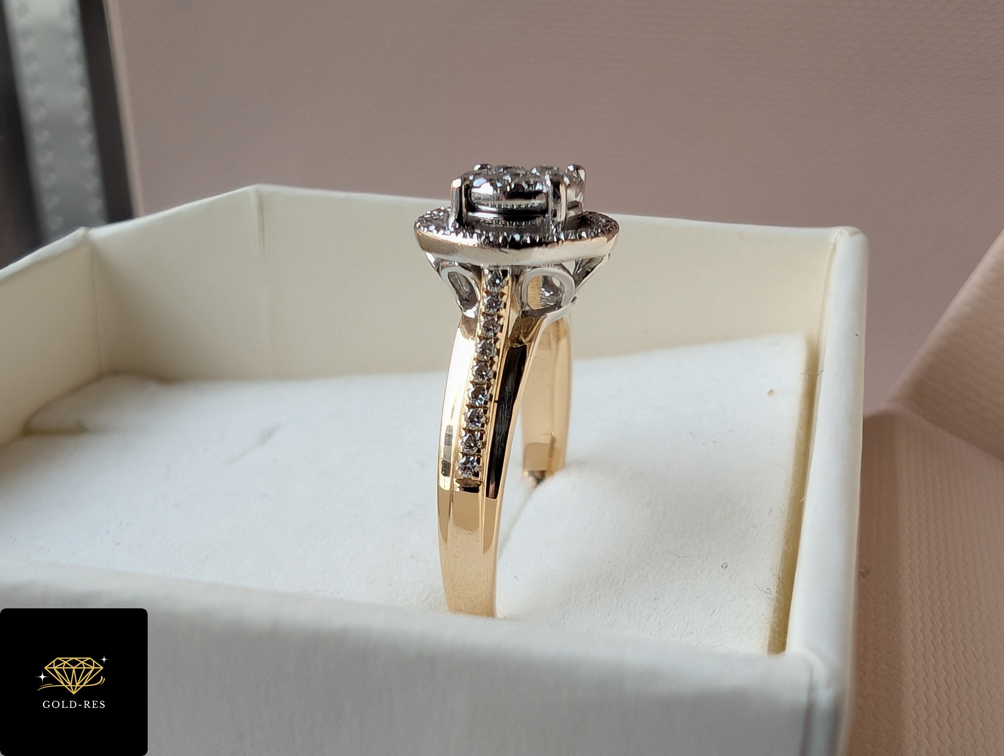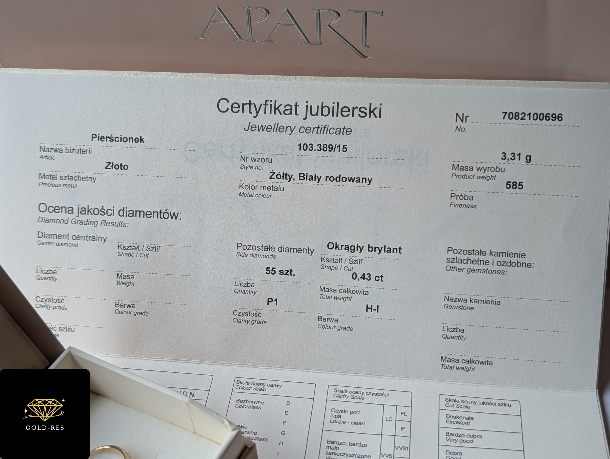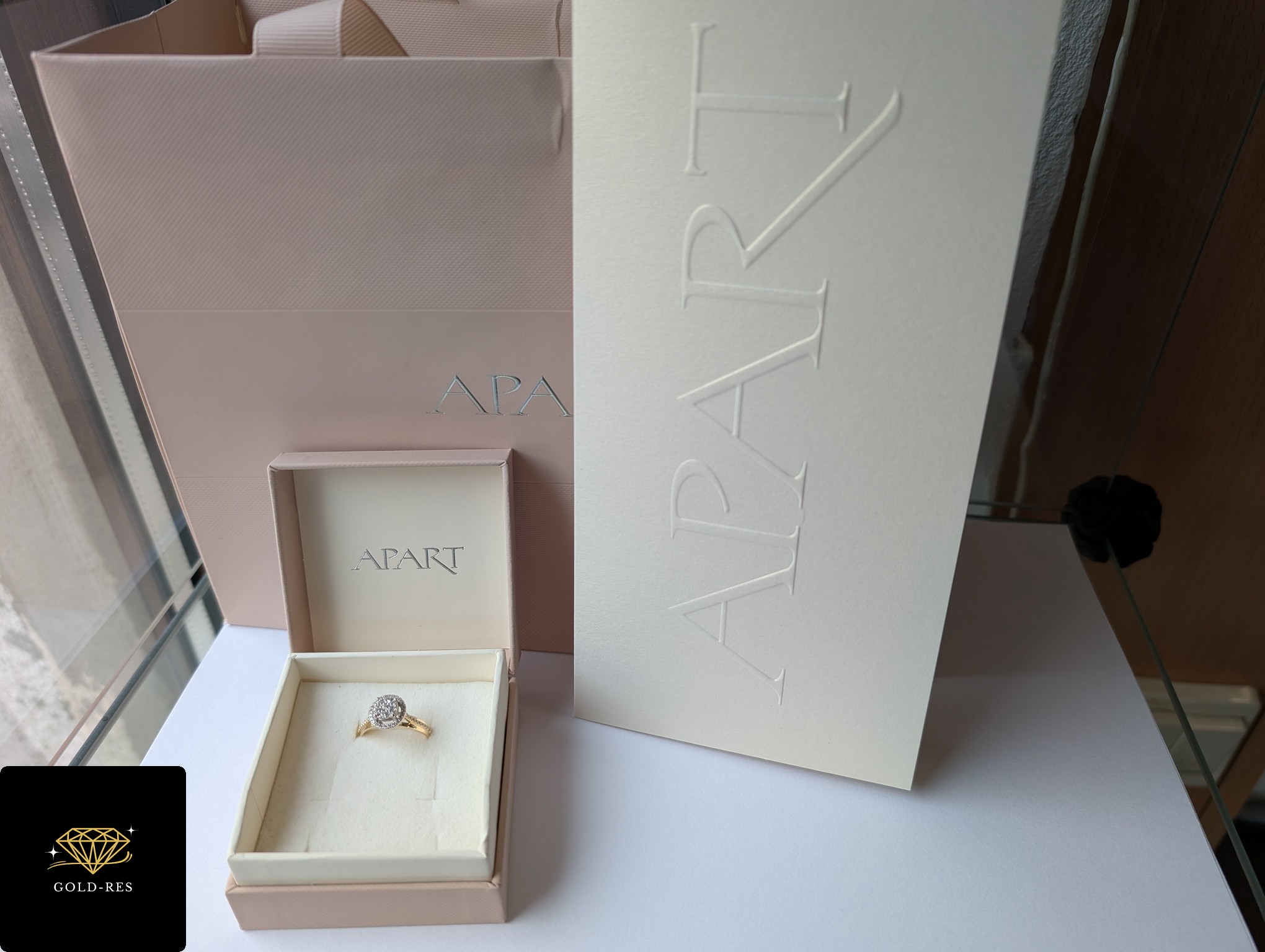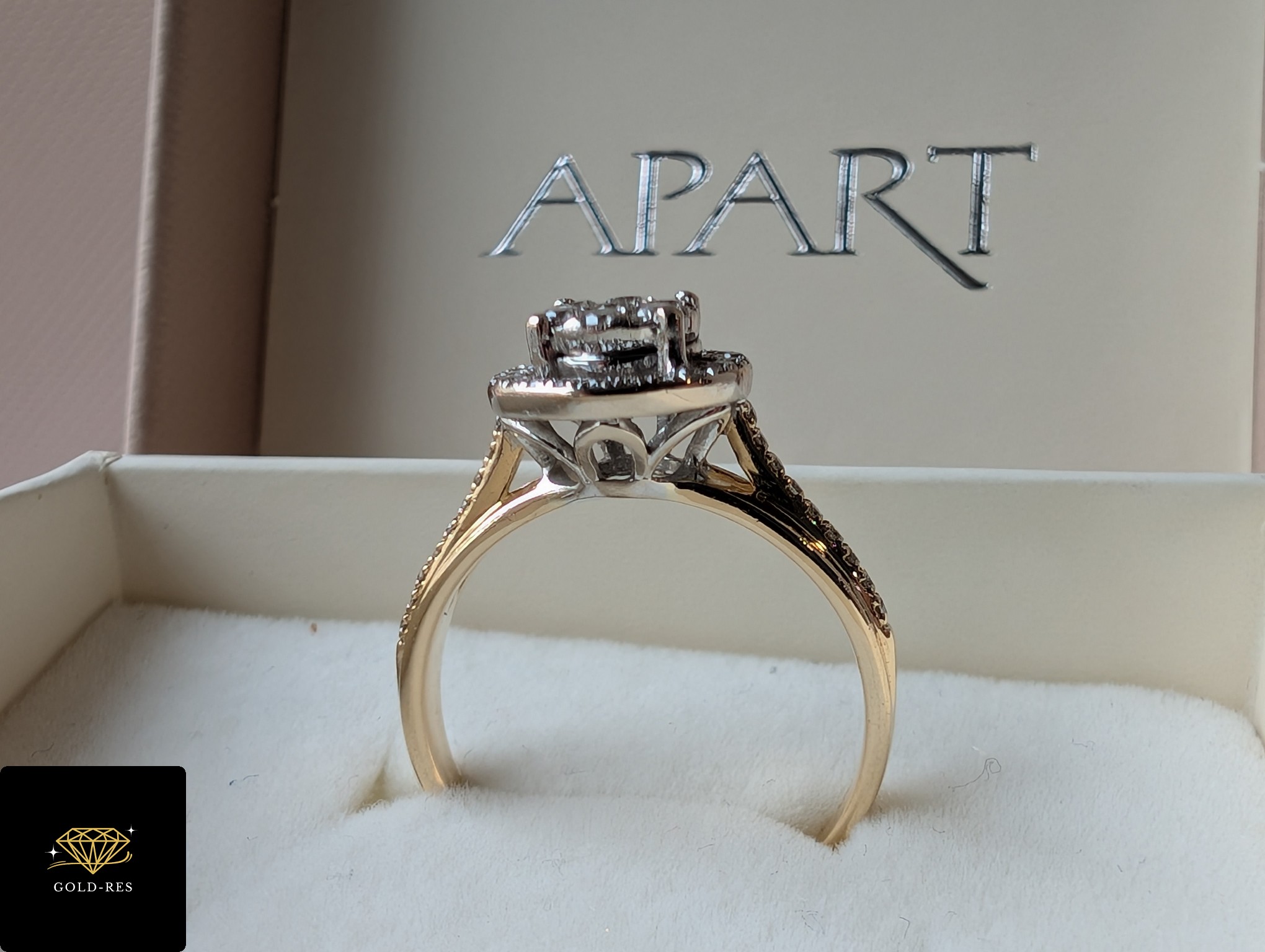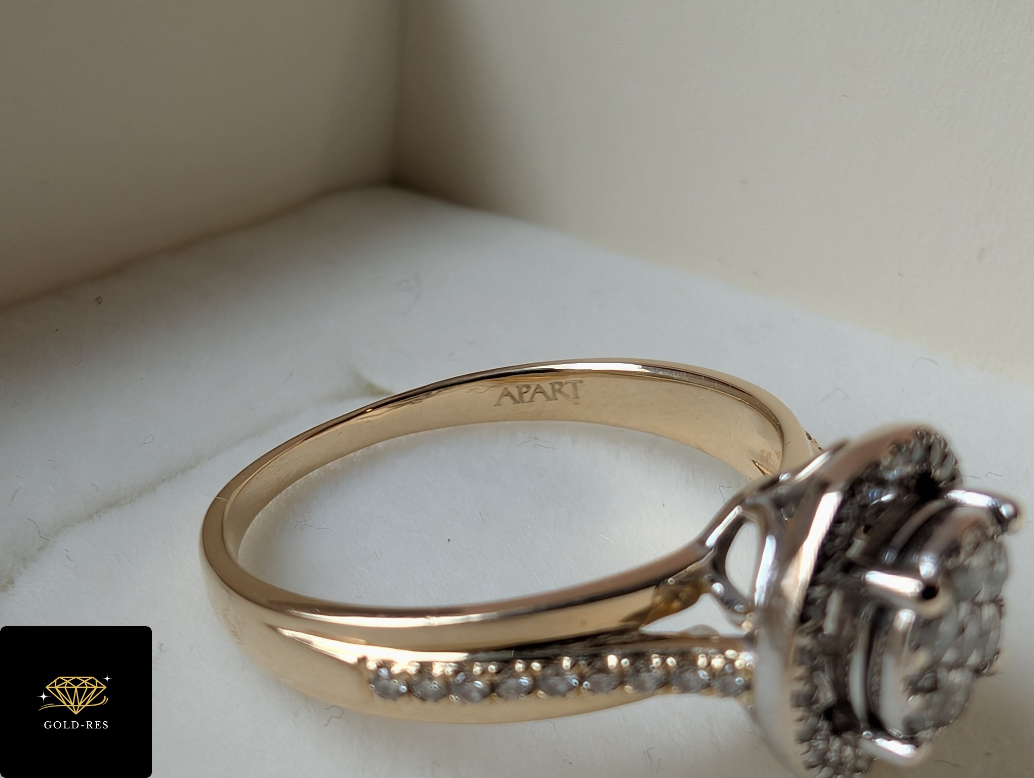 Do sprzedania złoty pierścionek z diamentami, w próbie złota 585. Wyrób jest używany – posiada puncę APART. Do wyrobu dołączony jest certyfikat.