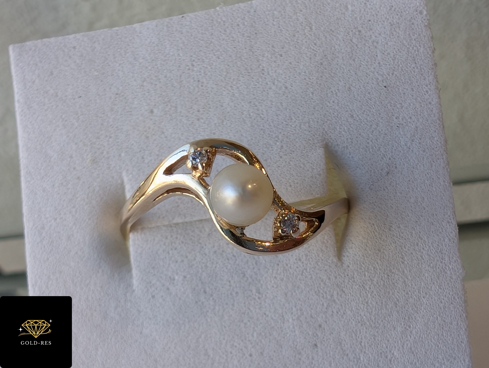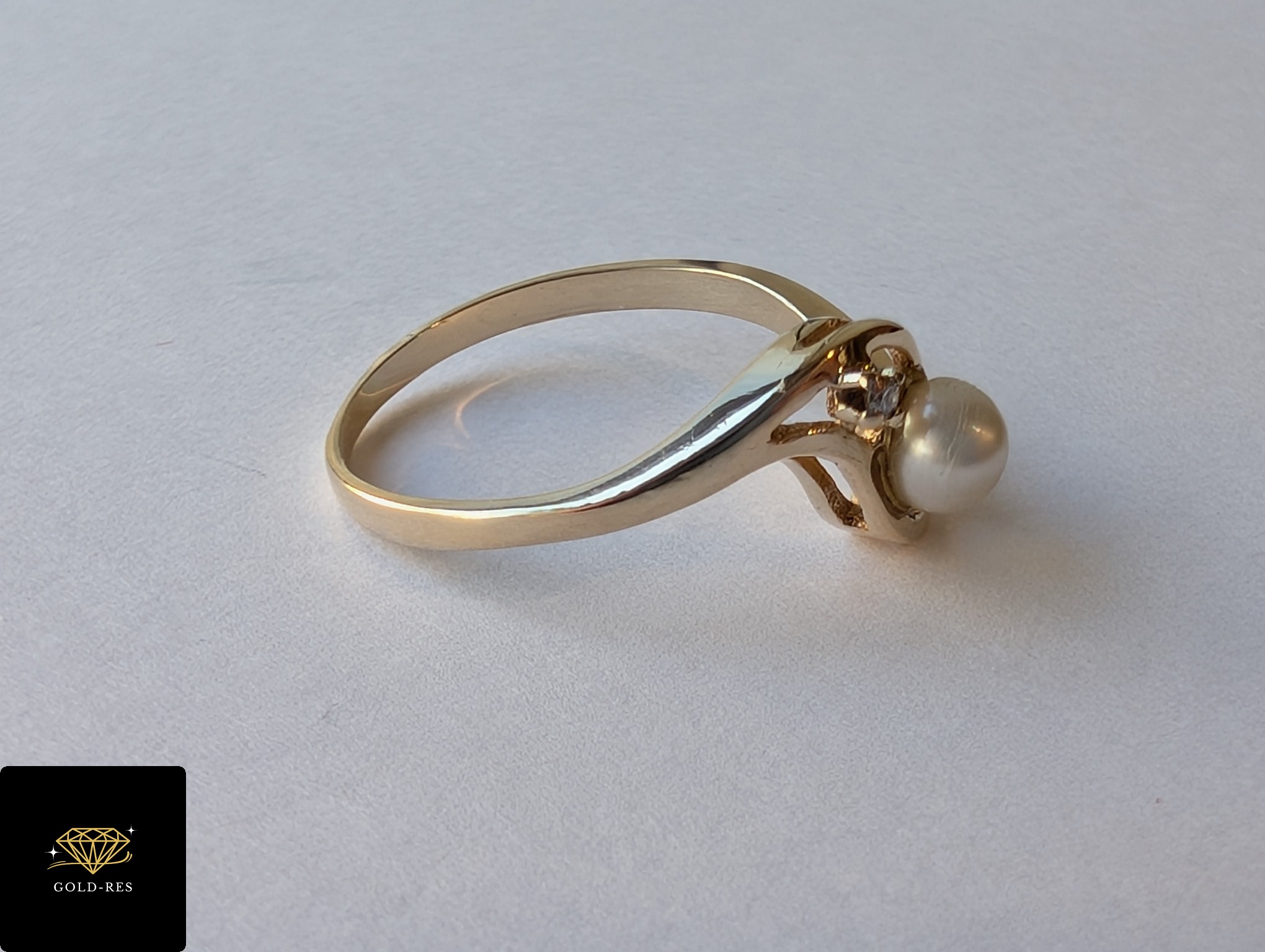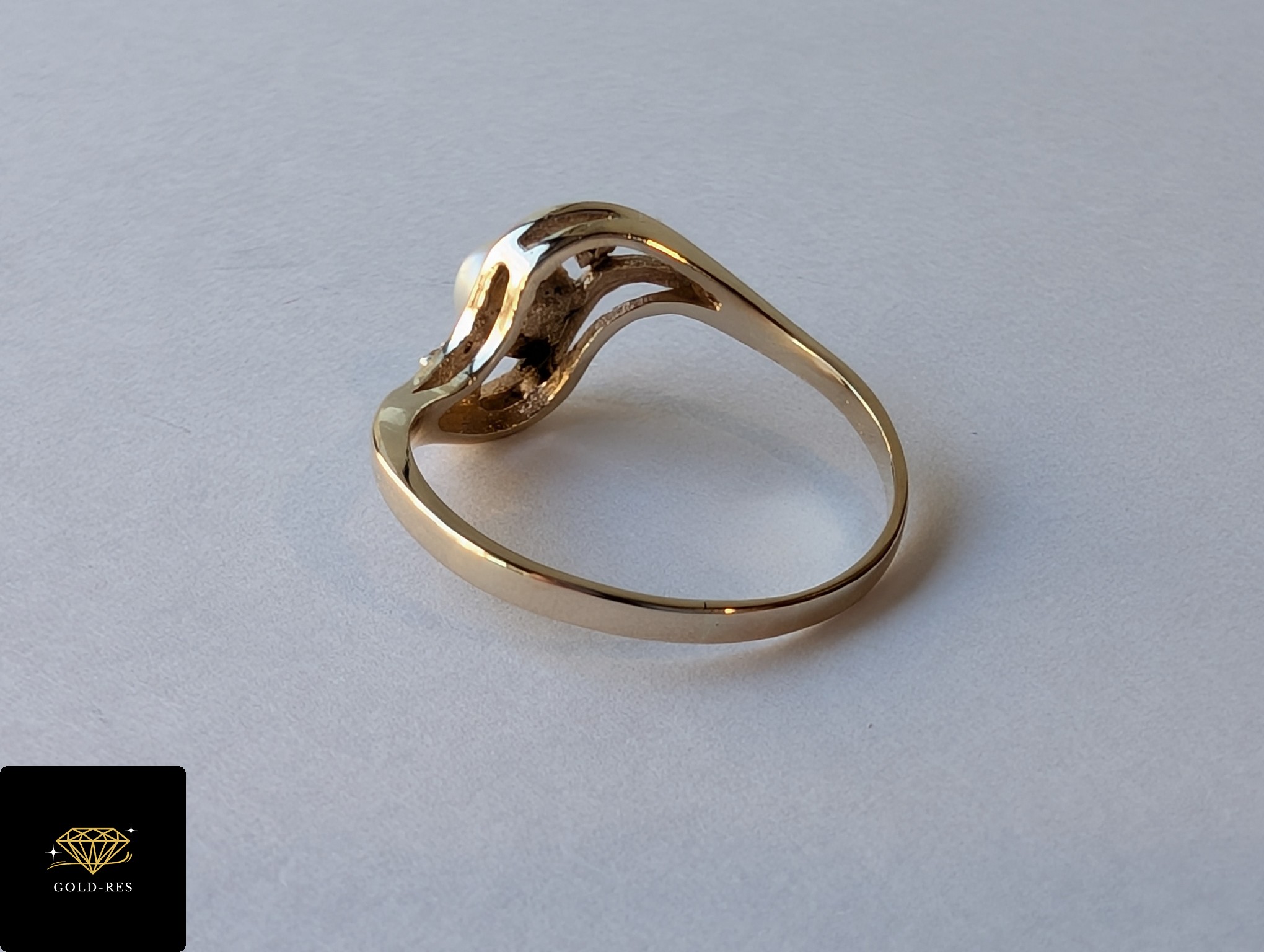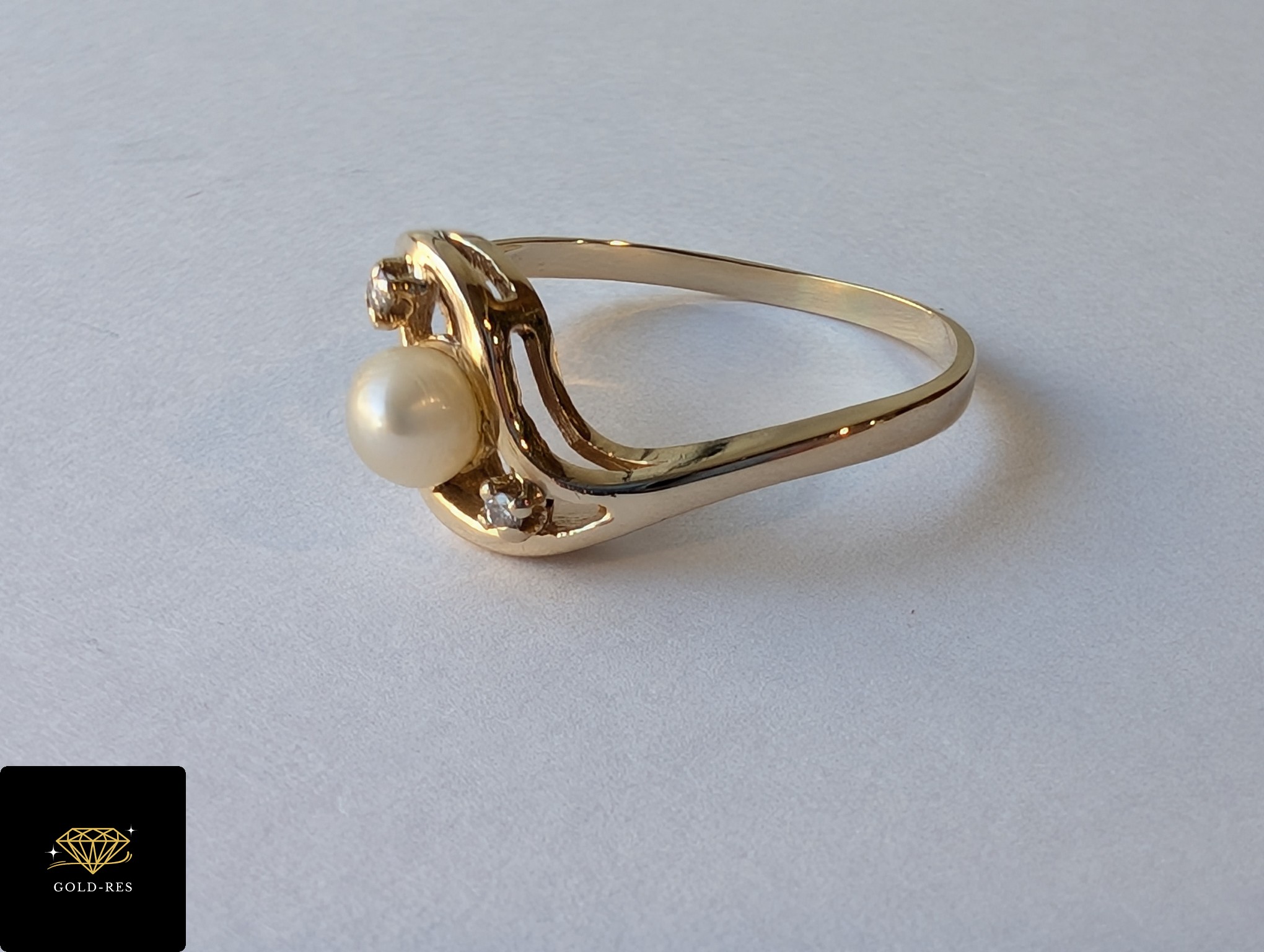Do sprzedania złoty pierścionek z diamentami, w próbie złota 585. Wyrób jest używany. Do kamieni nie ma certyfikatu – można je sprawdzić u pobliskich jubilerów.